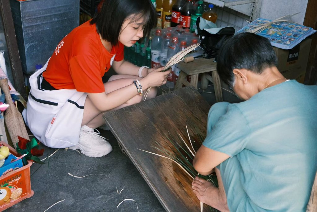 图为实践团队成员向当地手艺人学习竹编。桂文婷 供图