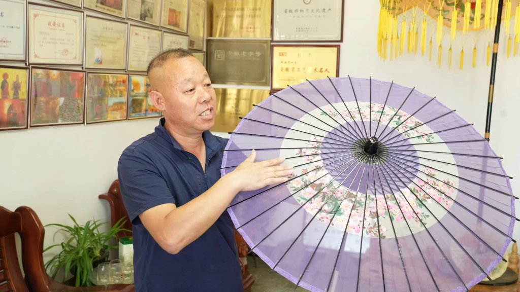 图为传承人郑国民向实践团队介绍油纸伞相关知识。黄俊 供图