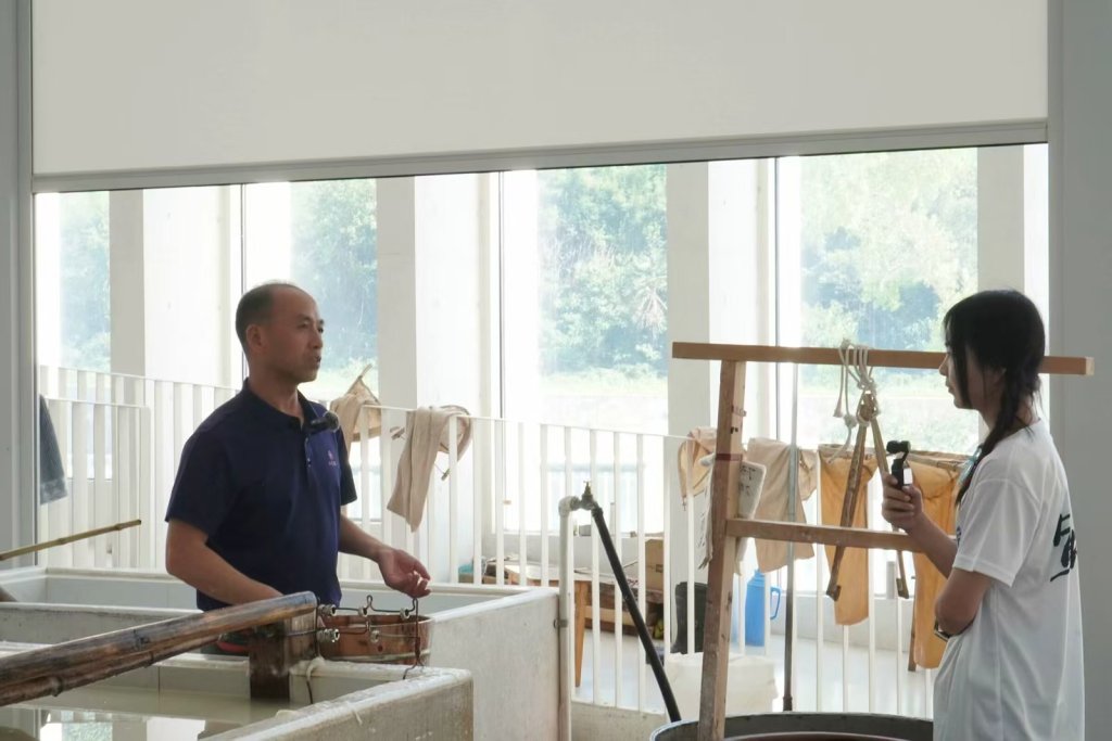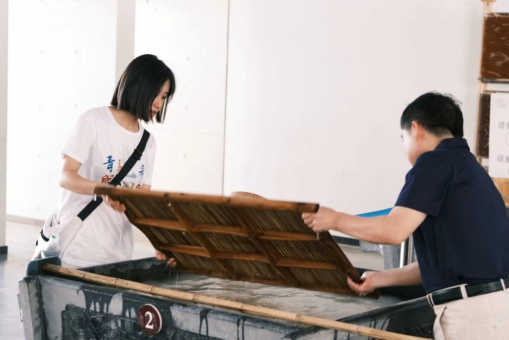 图为实践团队成员在中国宣纸文化园体验捞纸。 简迅 供图