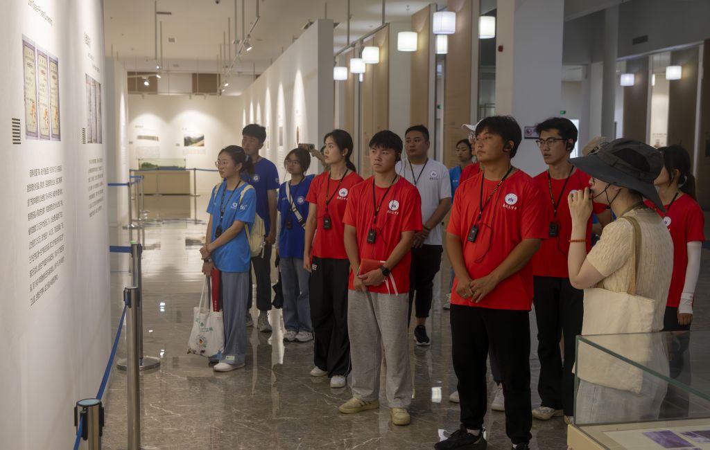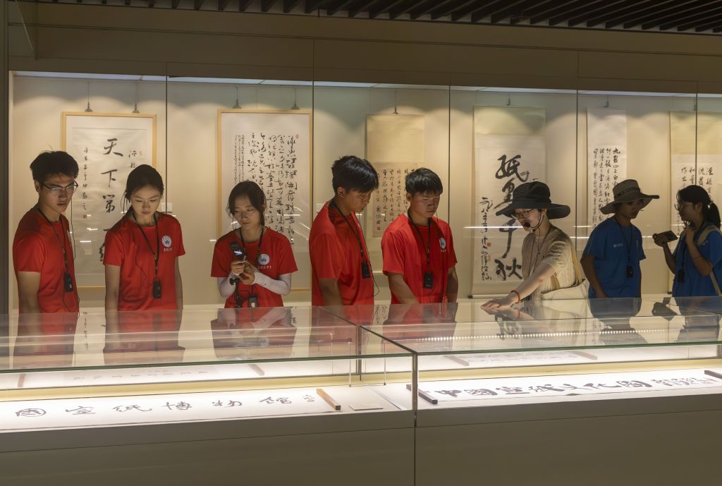 图为讲解员为实践团成员介绍宣纸的发展脉络。马俊 供图