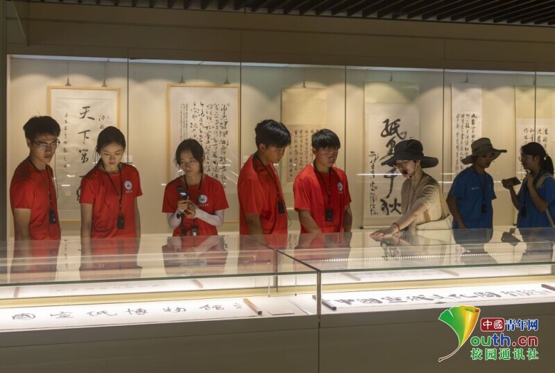 图为讲解员带领实践团成员欣赏书画作品。马俊 供图