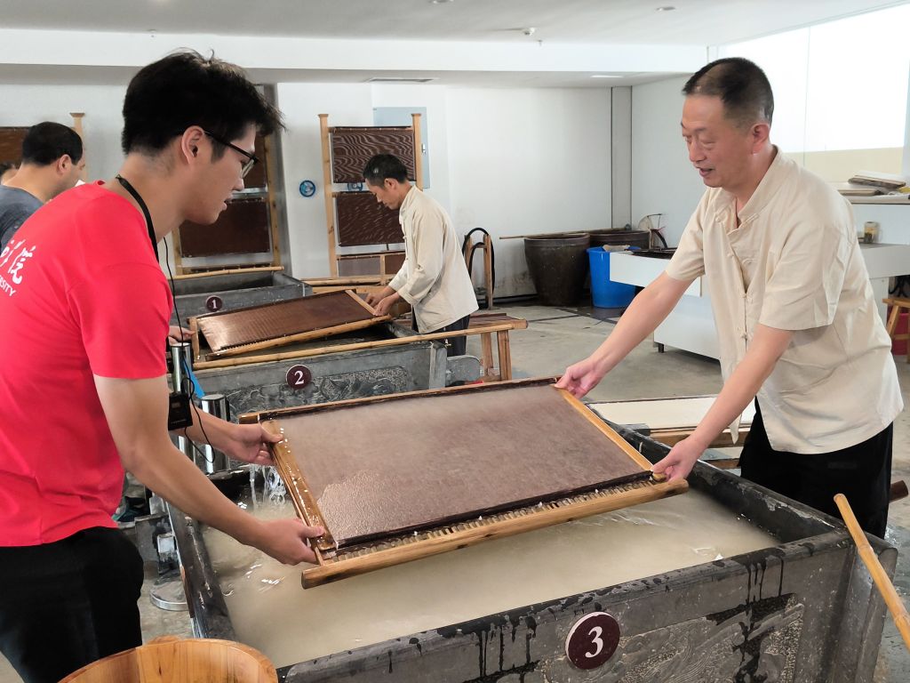 图为实践团成员观看制作宣纸过程中的切片工艺。马俊供图
