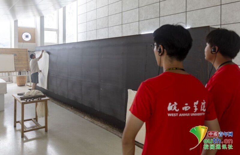 图为实践团成员观看宣纸制作过程中的晒纸工艺。马俊 供图