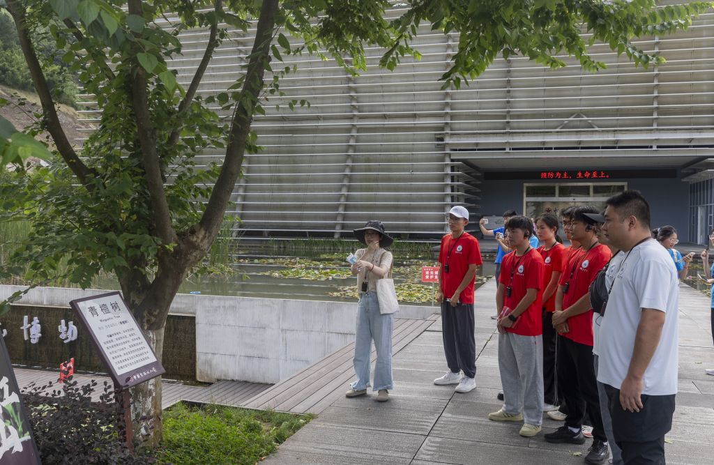 图为讲解员为实践团成员介绍宣纸原料青檀树。马俊供图